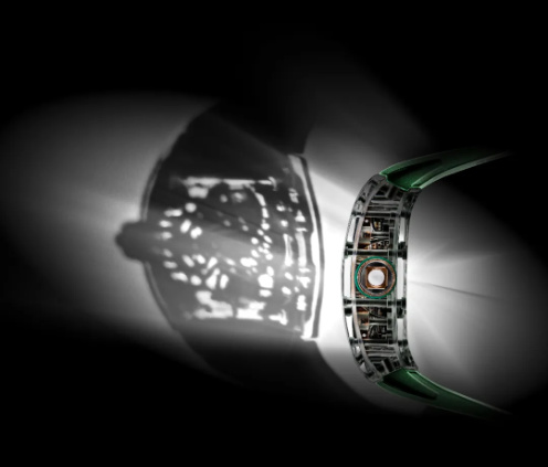 技术层面,RM07-01搭载品牌自主研发的CRMA2自动上链机芯,其可变几何结构摆陀可通过两枚移动砝码调节上链效率,精准适配不同佩戴者的活动习惯。五级钛合金打造的底板与桥板经微喷砂与电浆处理,在确保机械刚性的同时,为镂空结构注入通透光影。尽管工艺如此复杂,金属中层表壳的抗震性依然毫不逊色,成功通过品牌所有冲击测试。