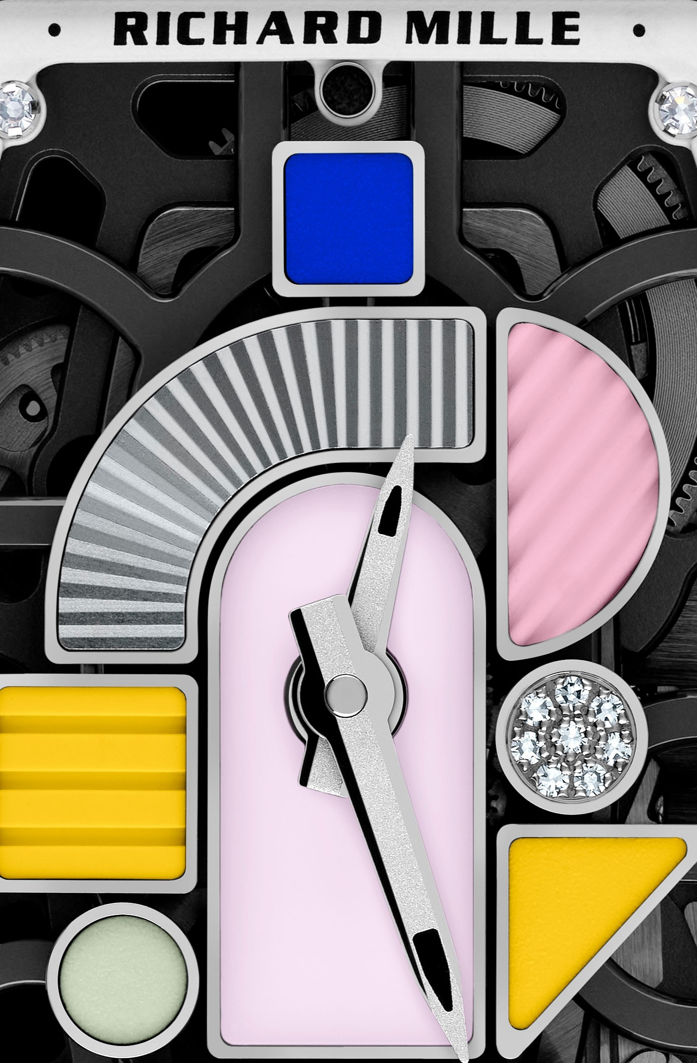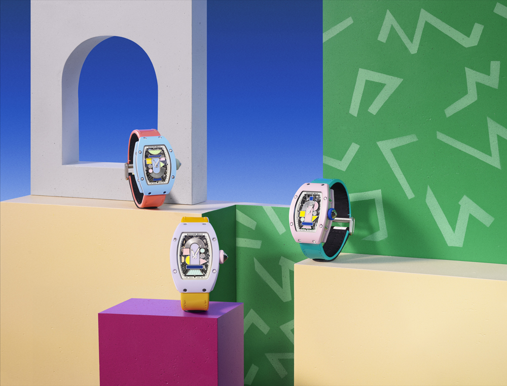 RM07-01彩色陶瓷女士腕表系列代表了品牌在色彩表达与工艺融合上的最新突破。该系列从20世纪80年代意大利兴起的孟菲斯设计风格中汲取灵感,这种设计思潮以打破常规、自由不羁著称。
