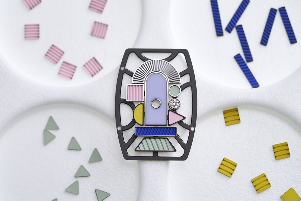 彩色陶瓷款采用浅粉、浅紫、浅蓝三种明快色调,表壳材质选用生物相容性TZP陶瓷——这种经特殊工艺打造的材质不仅纤薄轻盈、强度卓越,更能确保色彩持久鲜亮,历经岁月仍不褪色。表盘中央的红金骨架雕刻着波浪曲线与几何纹样,与激光切割橡胶嵌花、钻石镶嵌细节形成多元材质对话,完美呼应孟菲斯风格“自由不羁”的精神内核。